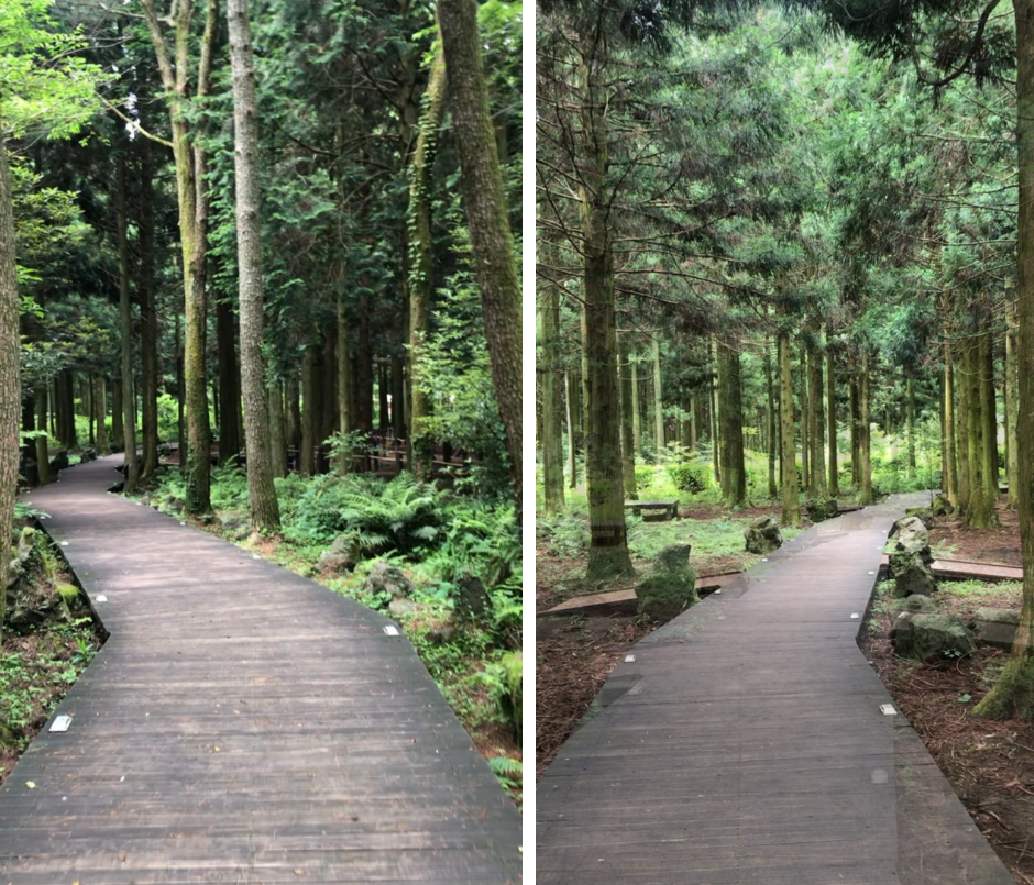 우연히 붉은오름 자연휴양림을 알게 되어. 사려니숲길은 정말 사람이 많은데 오히려 이곳은 아침 9-10시경 가니 사람도 없고, 조용하게 힐링 할수 있는곳이라 정말 좋습니다. 특히 저 데크길이 너무 인상적이었는데 주변에는 삼나리가 높게 뻗어있고, 바위틈에 이끼와 풀, 그리고 중간중간 쉴 수 있는 의자들이 있어 정말 좋습니다. 이날 정말 습하고 더운 날씨였는데 이 숲길은 에어컨을 튼 것처럼 정말 시원함을 느낄 수 있습니다.