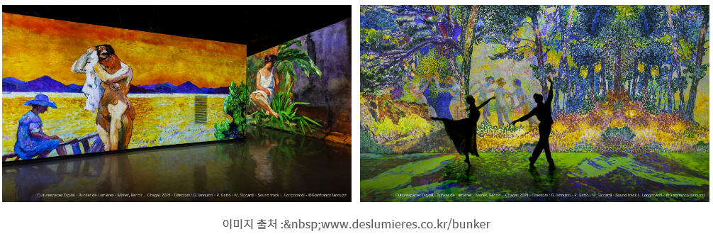 어른들과 함께 여행을 한다면 강력 추천이다. 걸으면서 관람을 하는 것보다 의자 또는 바닥에 앉아서 음악에 맞춰 벽면과 바닥에 나오는 유명 예술가의 작품을 감상하면 좋습니다. 다리가 아파 오래 걷기 힘든 분들이라면 더할 나위 없이 좋을 것 같습니다. 이곳은 원래 과거 전쟁을 대비한 국가기관 통신시설로 설비된 벙커였는데 오랜 기간 쓸모가 없어 프랑스 몰입형 미디어아트 전시관으로 재생되었다고 합니다.