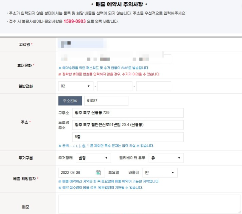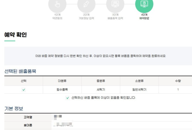 4. 접수하는분의 인적 사항과 수거할 장소, 주거 구분, 엘리베이터 유무과 수거 일자 등을 입력합니다.