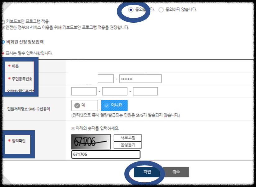 4. 동의 체크하고 이름/주민번호/연락처/인증 확인
