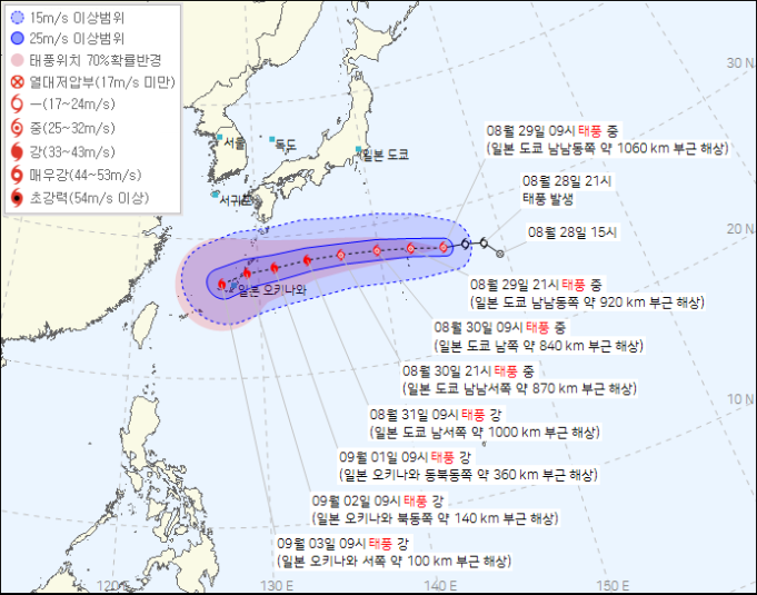 28일 일본 남동쪽해상에서 발생한 힌남노는 오키나와를 향해 서진하고 있으며 31일 오전 3시에 오키나와 동쪽 약 390km 해상을 지났습니다. 지금 이 경로대로라면 그대로 한반도 남쪽을 횡단하며 중국대륙 동쪽 해안에 상륙하게 되겠지만,  9월 2일쯤에 경로를 바꿔 북쪽을 향하게 될 것으로 전망예상하고 있습니다.