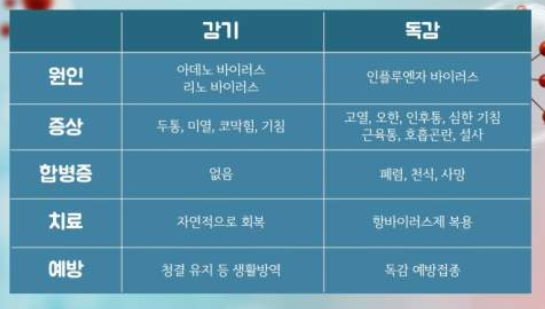 일반 감기와 다른 점은 콧물, 기침, 인후통 등의 국소적인 증상보다는 발열, 근육통, 두통 등의 전신적인 증상이 훨씬 더 뚜렷하게 나타납니다. 주로 날씨가 춥고 건조한 10월부터 5월까지 독감의 발생률이 높습니다. 올해는 독감 유행이 될것이라는 전망도 있기 때문에 각별히 유의하셔야합니다.