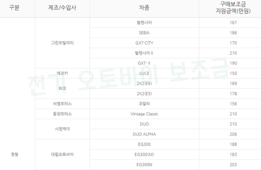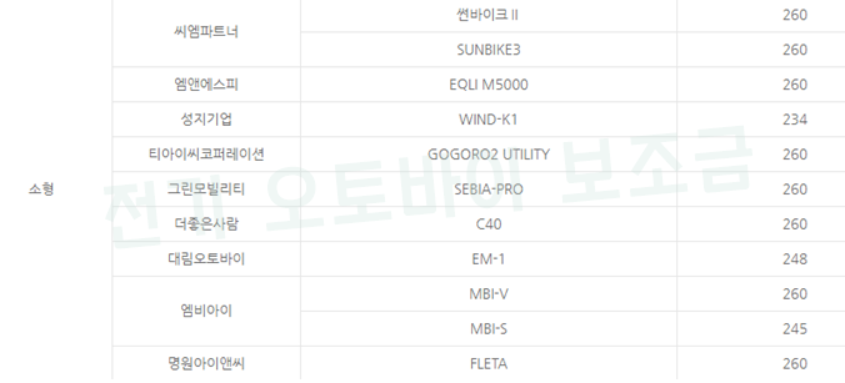 소형은 씨엠파트너의 썬바이크Ⅱ, SUNBIKE3, 엠엔에스피의 EQLI M5000, 성지기업의 WIND-K1, 티아이씨코퍼레이션의 GOGORO2 UTILITY, 그린모빌리티의 SEBIA-PRO더좋은사람의 C40, 대림오토바이의 EM-1, 엠비아이의 MBI-V/S, 명원아이앤씨의 FLETA가 있으며 234~260만원 정도 보조금을 지원 받으실 수 있습니다.