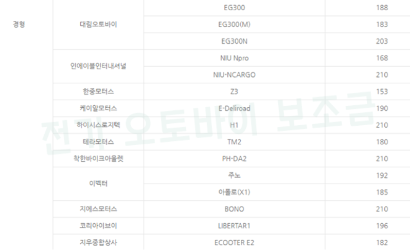 오토바이의 경우 '전기이륜차'에 해당하므로 전기이륜차 보조금을 확인하시면 됩니다. 전기이륜차는 경형과 소형, 대형/기타형으로 나뉘어져 있습니다. 제조/수입사와 차종, 구매보조금 지원금액이 안내되어 있습니다. 경형,소형,대형 순으로 알아 보도록 하겠습니다.