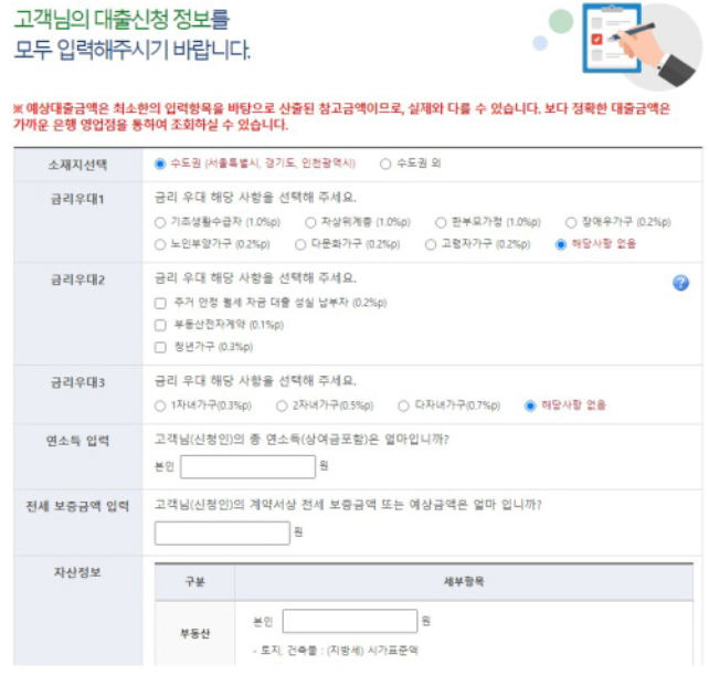 해당 업무를 취급하는 은행에는 우리, 국민, 기업, 농협, 신한이 있습니다. 모의계산기를 통해 본인이 조건에 충족하는지 확인해보고, 은행에 직접가서 신청하는 방법이 있습니다. 또는 온라인 기금e든든 홈페이지를 통해 가능합니다.