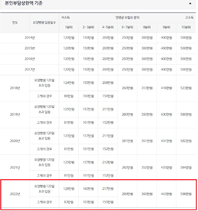 예를 들어 2022년도 기준으로 병원비가 1천만원이 나왔는데 요양병원에 120일 초과 입원한 경우라고 가정하고, 소득은 1분위에 속한다고 하면 본인이 부담해야 될 금액은 128만원으로 국민건강보험 환급금을 신청해 872만원을 돌려받게 되는 것으로 예시를 들 수 있습니다.