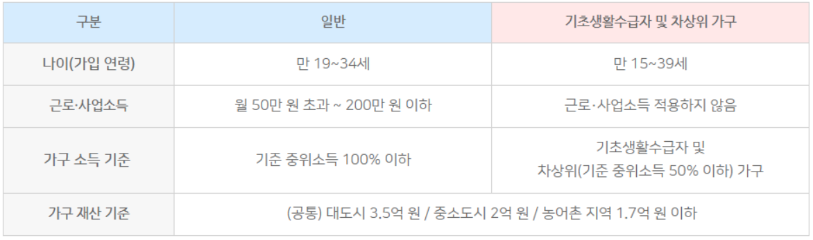 또한 청년이 속한 가구의 소득이 기준 중위소득 100% 이하이고, 가구 재산은 대도시 3.5억 원, 중소도시 2억 원, 농어촌 지역 1.7억 원 이하 기준을 충족해야 합니다.