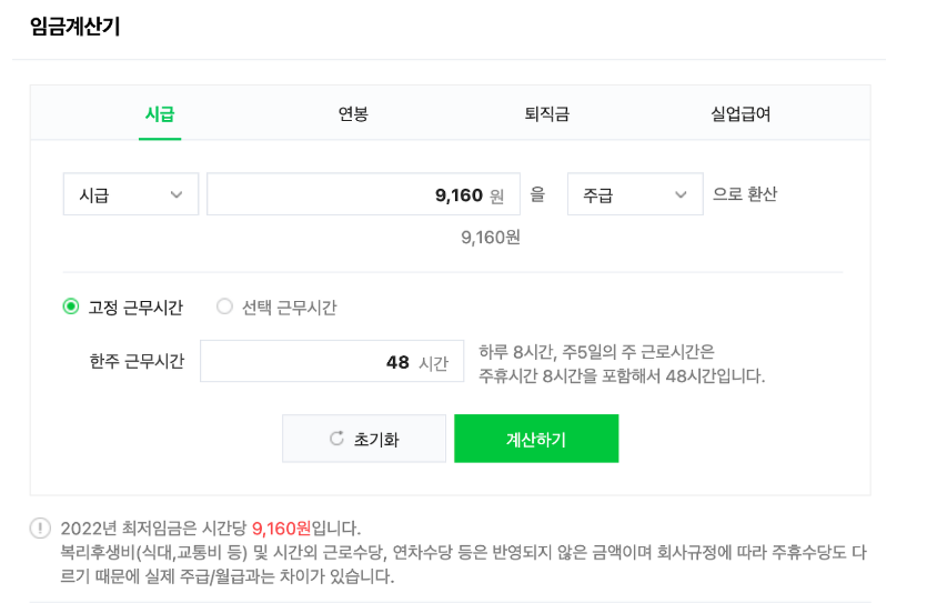 올해 최저임금은 시간당 9,160원이며, 이것을 제외하고 추가로 식대, 교통비 및 기본 시간을 제외한 근로수당과 연차수당등은 반영하지 않은 금액입니다. 이는 회사규정에 따라 주휴수당도 다르기 때문에 실제 주급/월급과는 차이가 생길 수 있습니다.