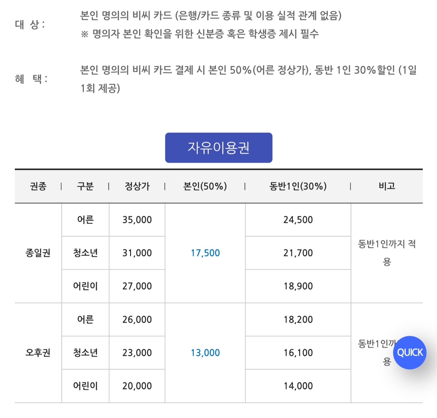 지금부터 입장료와 할인 되는 카드 그리고 어떠한 놀이 기구들이 있는지 알아보도록 하겠습니다.