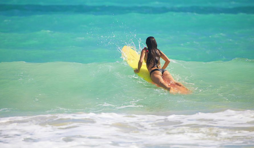 서핑용 보드를 밀고 가는 연습을 통해 파도에 잡히는 감각을 익히세요.