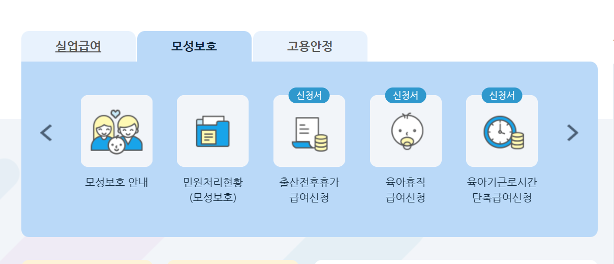 3. 모성보호 클릭 , 육아휴직 급여신청 클릭
