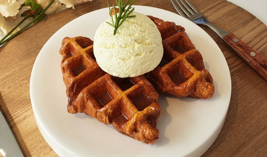 - 와플은 와플 메이커에서 구워진 후 완성된 모양 그대로 접시에 담겨 서빙됩니다. 와플은 따뜻한 상태에서 바삭한 식감