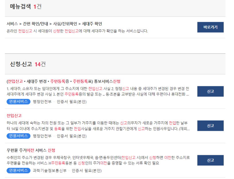 2) 검색창에 전입신고신청 입력