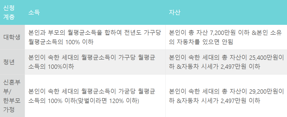 대학 재학생, 복학예정인 대학생, 미혼, 본인 총 자산 8,600만 원 이하며 자동차 미소유