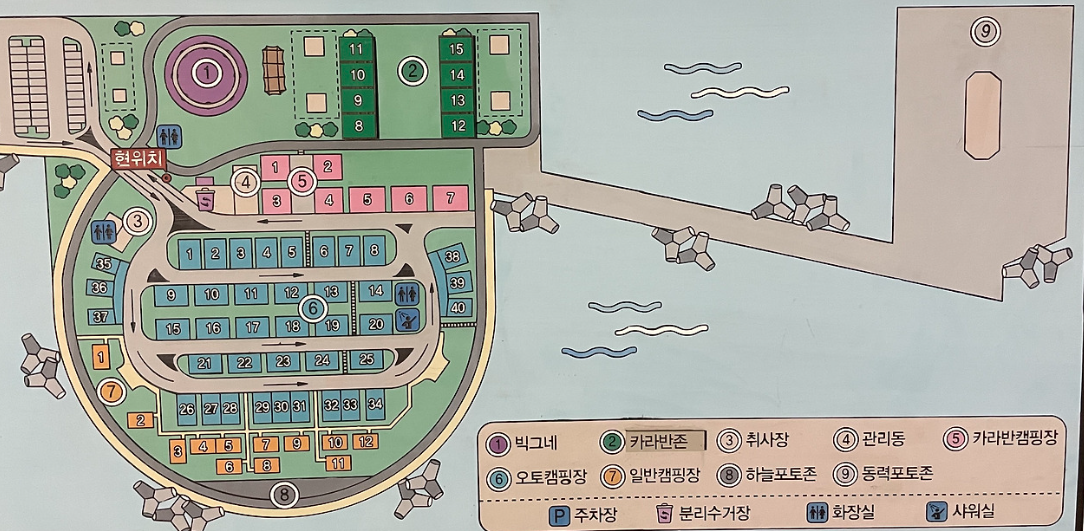 마리노오토캠핑장 전체 도면입니다. 데크가 설치된 장소와 카라반을 동시에 이용가능하니 시기와 날씨에 따라 고려해서